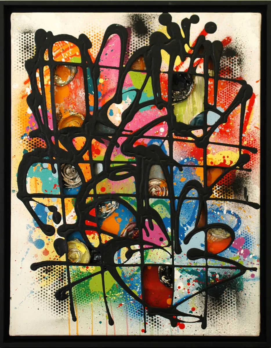 Spray et acrylique sur toile 65 x 50 cm Pièce unique Cornière en bois naturel (70 x 55 x 5 cm) Signée par l’artiste Certificat d’authenticité