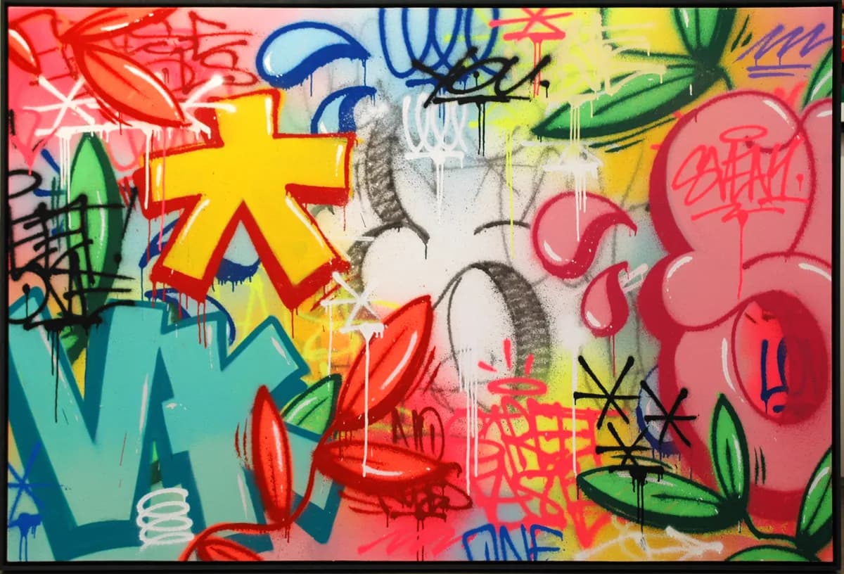 Acrylique et spray sur toile 120 x 180 cm Pièce unique Cornière en bois noir (125 x 185 x 5 cm) Signée par l’artiste Certificat d’authenticité